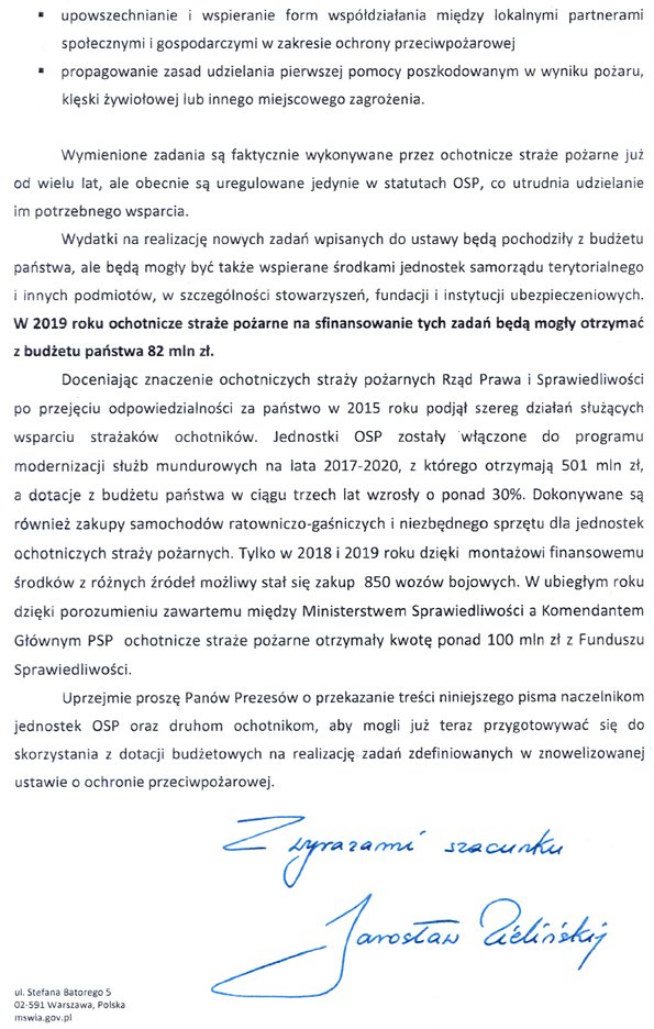 List sekretarza stanu MSWiA Jarosława Zielińskiego do druhen i druhów ochotniczych straży pożarnych w sprawie dodatkowych środków finansowych przeznaczonych na realizację zadań OSP.