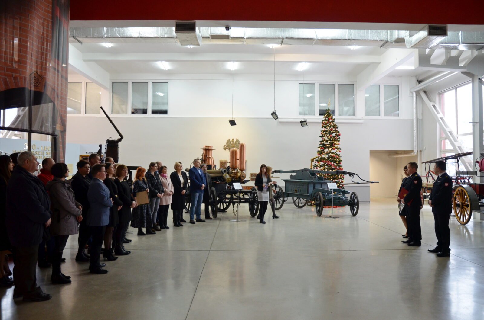 Następnie odbyło się otwarcie wystawy. Jako pierwsza głos zabrała bryg. Anna Łańduch. Tytułem wstępu opowiedziała o okolicznościach wydania pierwszego numeru gazety, co miało miejsce dokładnie 15 grudnia 1912 r. Wspomniała także o Bolesławie Chomiczu i Józefie Tuliszkowskim – wybitnych współtwórcach periodyku. Po przecięciu wstęgi, gości oprowadzał po wystawie Dariusz Falecki z Wydziału Nauko-Oświatowego. Opowiedział o częściach składowych ekspozycji, przybliżył zgromadzonym sylwetki Stefana Norblina i Tadeusza Pietrzyka – znanych artystów i zarazem projektantów szaty graficznej „Przeglądu”, a także zwrócił uwagę na sposób eksponowania muzealiów związanych z gazetą w nowych gablotach. Po tej części uroczystości bryg. Rafał Jureczko – Dyrektor CMP zaprosił gości z Komendy Głównej do zwiedzenia muzeum, a następnie wszystkich obecnych na okolicznościowy poczęstunek świąteczny. Na spotkaniu świątecznym st. bryg. Krzysztof Pietrasik odczytał list od gen. brygadiera Andrzeja Bartkowiaka, w którym Komendant Główny złożył pracownikom Centralnego Muzeum Pożarnictwa życzenia świąteczne oraz życzył dalszych sukcesów