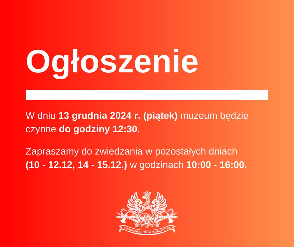 Uprzejmie informujemy, że w Święto wszystkich Świętych, tj. 01.11.2024r. (piątek) muzeum jest nieczynne. Zapraszamy na zwiedzanie w sobotę (02.11.2024r.) oraz niedzielę (03.11.2024r.) w godzinach 10:00-16:00.
